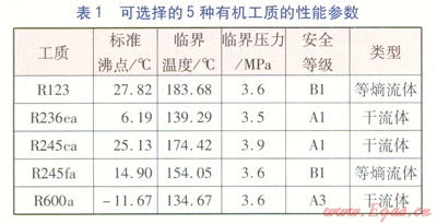 可選擇的5種有機(jī)工質(zhì)性能參數(shù)見(jiàn)表1。由表1可知,在5種有機(jī)工質(zhì)中,Rl23、R245fa均為等熵流體,安全等級(jí)同為B1。R123的臨界溫度較高,適用于回收較高溫度的余熱,消耗臭氧潛能值(Ozone Depression Potential,ODP)為0.0012。R245fa的臨界溫度較低,與燃?xì)鈨?nèi)燃機(jī)的余熱溫度相適應(yīng),ODP為零。綜合比較,選取R245fa作為有機(jī)朗肯循環(huán)發(fā)電系統(tǒng)的有機(jī)工質(zhì)。