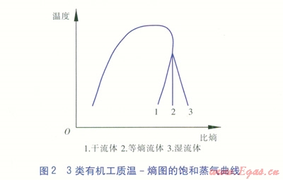 有機(jī)工質(zhì)對(duì)有機(jī)朗循環(huán)發(fā)電系統(tǒng)的性能影響較大。有機(jī)工質(zhì)可根據(jù)溫-熵圖飽和節(jié)氣曲線的右半部分的斜率分3類(見(jiàn)圖2):第一類:斜率為負(fù)的濕流體,這些流體的等熵膨脹易產(chǎn)生凝結(jié)現(xiàn)象,在透平內(nèi)膨脹做功后凝結(jié),易對(duì)透平造成危害。第二類:斜率為正的干流體。第三類:近似垂直的等熵流體。干流體與等熵流體可避免濕流體造成的危害,另外還應(yīng)要考慮有機(jī)工質(zhì)的熱力學(xué)性能和環(huán)保特性。