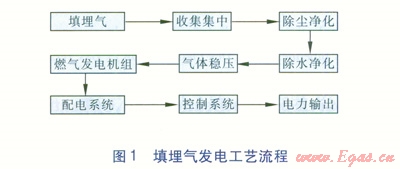 填埋場填埋氣發(fā)電原理是將固體廢棄物填埋場產(chǎn)生的填埋氣通過收集系統(tǒng)集中,再通過預(yù)處理裝置凈化(除塵、除水等)、穩(wěn)壓后送入燃氣發(fā)電機組,發(fā)電后通過配電系統(tǒng)、控制系統(tǒng),將發(fā)出的電能輸送到電網(wǎng)(填埋氣發(fā)電工藝流程見圖1)。