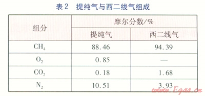 提純氣的調(diào)制要求是在滿足l2T天然氣的情況下與西二線氣滿足燃氣互換性的要求。經(jīng)計算,當(dāng)提純氣與西二線氣以體積比為1:1.5摻混時,調(diào)制氣高華白數(shù)為47.1MJ/m3,燃燒勢為37.36,滿足12T天然氣標(biāo)準(zhǔn)。