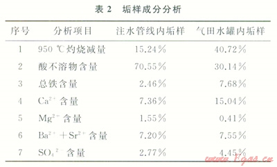 在對(duì)白馬8井氣田水罐清洗后發(fā)現(xiàn),罐內(nèi)已形成大塊片狀垢樣,垢樣顏色呈棕黃色;而在注水管線內(nèi)垢樣的橫截面上大多是顏色較深的層狀細(xì)條紋,有明顯的界面痕跡,分布均勻,垢樣內(nèi)表面大都粗糙不平,有豆?fàn)铑w粒,垢樣較硬,滴鹽酸發(fā)生少量起泡,由此可以判斷結(jié)垢物主要成分不是常見的碳酸鹽層狀垢樣。
