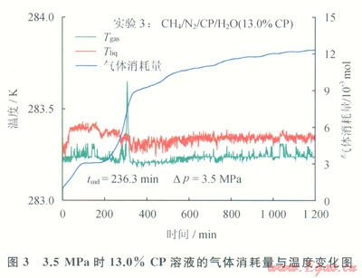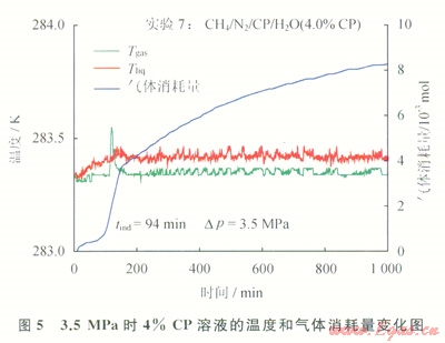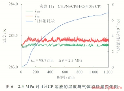 圖5給出了Dp=3.5MPa時(shí),低甲烷濃度煤層氣在4%CP溶液中生成氣體水合物情況。當(dāng)反應(yīng)開(kāi)始94min后,氣相溫度突然升高,氣體消耗量從1.0×10-3mol快速升高到3.6×10-3mol。圖6給出了低甲烷濃度煤層氣在Dp=2.3MPa、4%CP溶液中生成氣體水合物情況。與圖5的結(jié)果類(lèi)似,當(dāng)反應(yīng)開(kāi)始98.7min后,氣體消耗量從1.1×10-3mol突然增加到3.2×10-3mol,表明水合物此刻在環(huán)戊烷—水界面開(kāi)始結(jié)晶并生長(zhǎng)。