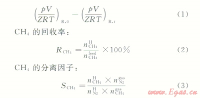 式中p、V、T分別為壓力、體積和溫度;Z為氣體壓縮因子,由Pitzer公式關(guān)聯(lián)[15];nHCH4、nHN2分別為水合物捕集的CH4和N2摩爾量;nfeedCH4為反應(yīng)過(guò)程中總CH4摩爾量;ngasCH4、ngasN2分別為反應(yīng)結(jié)束時(shí)反應(yīng)釜中剩余的CH4和N2摩爾量。