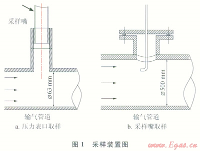 井口管道的直徑為63mm,站內(nèi)匯管管徑為500mm??紤]到站內(nèi)實(shí)際情況,井口的取樣位置選擇在流量計(jì)前的短接處,更換為專門加工帶有采樣孔的短接[7];站內(nèi)匯管取樣位置首選能夠插入采樣嘴的位置,若無此類位置供選擇,就選擇壓力表口進(jìn)行取樣[8]。采樣裝置如圖1所示。