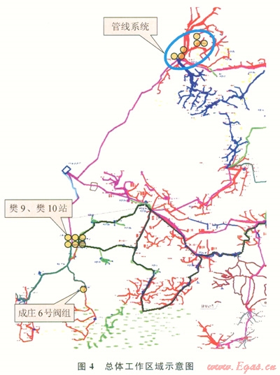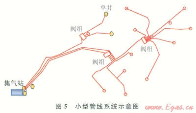 區(qū)塊內(nèi)小型管線系統(tǒng)如圖5所示,共5個(gè)測(cè)試點(diǎn)(以黃色圓形表示):華固18-2井(單井產(chǎn)氣量為516m3/d)、華固18-3井(單井產(chǎn)氣量為2774m3/d)、樊4集氣站的18號(hào)閥組采氣干線、樊4站進(jìn)口匯管、樊4站出口。