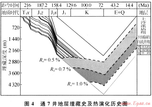 從圖4中可以看出中侏羅世末期,須家河組底部地層的鏡質(zhì)體反射率低,大都在0.4%~0.5%;晚侏羅世末期,達(dá)到成熟階段,鏡質(zhì)體反射率大于0.7%,已進(jìn)入生烴門限,開始大量生烴;白堊紀(jì)沉積時(shí)期,由于四川盆地中部的繼續(xù)抬升,西部坳陷區(qū)繼續(xù)下沉,使白堊系-第三系的沉積厚度在盆地坳陷區(qū)和中部隆起區(qū)形成較大的差異,在研究區(qū)雖然這一時(shí)期沉積厚度較薄,由于漫長時(shí)間對溫度的補(bǔ)償作用,鏡質(zhì)體反射率Ro也增高,進(jìn)入成熟階段,白堊紀(jì)-第三紀(jì)進(jìn)入成烴高峰期,現(xiàn)今仍然處于成烴高峰期(圖4)。因此,白堊系及以后的沉積階段是研究區(qū)須家河組油氣大量生成的時(shí)期。