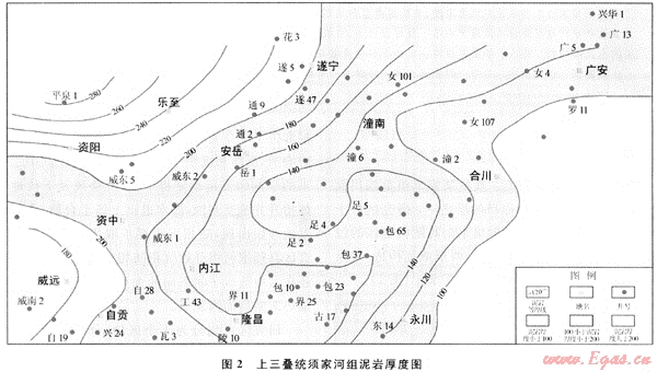 在川西金堂-彭縣-新津一帶,暗色泥巖厚度大(1000~1240m),最厚可逾1500m(隆豐1井),并央有煤層。往盆地的東南側(cè)為濱湖淺湖沼澤相區(qū),暗色泥巖減至100~300m,但煤層相對較發(fā)育。在川中地區(qū),煤層一般厚3m以上,具多層分布的特點(diǎn),層數(shù)多者可達(dá)數(shù)十層,單層厚度大者為1m左右,累計(jì)厚度超過25m。再往東南側(cè)則為三角洲平原-泛濫平原相區(qū),由于沉積相帶的變化,沉積物變粗,泥質(zhì)巖厚度明顯減薄,而且成煤條件也相對較差,所見煤層一般都很薄,總厚較小,多小于2.5m,局部僅以煤線形式出現(xiàn),且橫向上分布不穩(wěn)定。由于沉積相帶的變化和沉積中心的遷移,上三疊統(tǒng)須家河組從盆地的西北到東南層段也在發(fā)生變化。研究區(qū)內(nèi)上三疊統(tǒng)須家河組泥巖厚度變化很大,從100~300m,最大厚度在平泉1井,總的變化趨勢是從西北到東南,厚度逐漸減小(圖2),但各層厚度相差較大,分布范圍也不一致。