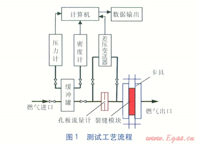 卡具是固定模塊的專門器具,主要作用是將模塊準確固定于測試管道中,在與模塊接觸面上用橡膠填料密封,并通過卡具旋緊螺栓來緊固及密封模塊??ň呖伸`活裝卸更換模塊,便于對不同模塊的測試。燃氣進出口管選用DN 400mm螺旋縫鋼管,孔板前直管段長度為15~20倍管外直徑,孔板后直管段長度為5倍管外直徑。測試中模塊后鋼管長度為1m,并引至室外,模塊后管道的阻力忽略不計,以模擬真實管道靜置時裂縫燃氣泄漏場景。測試過程中,有安全保障措施方案,室外配備專人監(jiān)控燃氣放散,確保安全。由于測試排放燃氣量不大,時間不長,對周圍大氣環(huán)境影響較小。測試工藝流程見圖1。