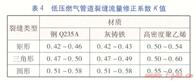 經多次實驗驗證,在燃氣低壓供氣狀況下,改變燃氣的壓力(緩沖罐內燃氣壓力),測試的K值不變,且K值受模塊壁厚影響甚微。由此得出管道裂縫流量修正系數K的取值范圍,見表4。