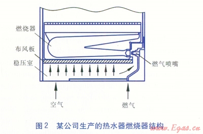 由風機送入的空氣需要通過穩(wěn)壓室、布風板進行均勻布風,以保證燃氣一空氣混合物在火排上正常燃燒。燃燒器內(nèi)空氣與燃氣的均勻混合,能夠避免燃氣燃燒不完全,繼而產(chǎn)生有毒有害物質的現(xiàn)象,從而提高熱水器安全性能。