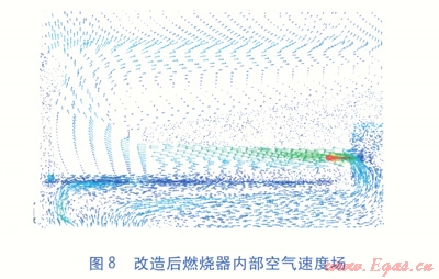我們采取的優(yōu)化方案是在穩(wěn)壓室內(nèi)增設一個擋板,并對布風板的開孔進行重新布置。改造后的穩(wěn)壓室結構及布風板開孔位置分別見圖6、7。改造后,通過調(diào)節(jié)擋板位置可以獲得合理的一二次空氣量比例,保證一次空氣量能夠穩(wěn)定且不受燃燒過程的影響。二次風由于處于一個楔形通道內(nèi),使得流動更容易均勻,消除穩(wěn)壓室內(nèi)的渦旋氣流的產(chǎn)生。改造后燃燒器內(nèi)部空氣速度場見圖8。