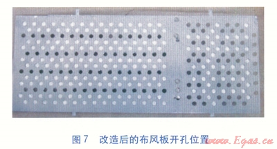 由測試結果可知,改造后的熱效率有所提高,平均提高了1.06%(絕對值)。煙氣中CO的體積分數(shù)顯著下降,平均下降了30%。這說明燃氣與空氣的混合更加均勻,燃燒狀況得以改善,有效地降低了煙氣中CO的含量。布風板規(guī)則的開孔位置對熱水器的熱效率沒有影響,降低了布風板的設計難度。