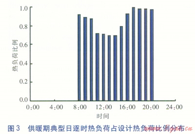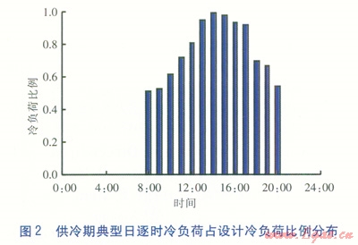 佛山地區(qū)某商業(yè)建筑總建筑面積約13×104m2,供冷期為4月至ll月,單位建筑面積冷負荷為100W/m2,供暖期為12月至次年1月,單位建筑面積熱負荷為15W/m2,工作時間為8:00—20:00。供冷期典型日逐時冷負荷占設(shè)計冷負荷比例分布見圖2,供暖期典型日逐時熱負荷占設(shè)計熱負荷比例分布見圖3。
