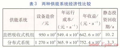 將兩種供能系統(tǒng)部分負荷運行時間折算成滿負荷運行時間,設(shè)定供冷期內(nèi)供能系統(tǒng)滿負荷運行時間為200d,供暖期供能系統(tǒng)滿負荷運行時間為30d。天然氣價格按3.79元/m3計算,電價按1.00元/(kW·h)計算,冷熱價均按100元/GJ計算。將年耗氣量、耗電量作為年運行成本,將年供冷量、供熱量、富裕發(fā)電量作為年收益。兩種供能系統(tǒng)的經(jīng)濟性比較見表3。由表3可知,在設(shè)定能源價格下,與直燃吸收式機組相比,分布式系統(tǒng)的年運行成本低,年收益高,靜態(tài)投資回收期僅為3.3a。