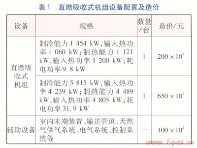 擬采用直燃型吸收機組、分布式系統(tǒng)分別為商業(yè)建筑供能??紤]到供冷期冷負荷較高,因此按50%的設(shè)計冷負荷(6500kW)作為設(shè)備選型依據(jù)。直燃吸收式機組、分布式系統(tǒng)設(shè)備配置及造價分別見表l、2。由表1可知,對于直燃吸收式機組,供冷期運行2臺直燃吸收式機組(總供冷能力為7269kW),供暖期運行供熱能力為1454kW的直燃吸收式機組,其余冷熱負荷由輔助電驅(qū)動熱泵空調(diào)設(shè)備承擔(dān)。由表2可知,對于分布式系統(tǒng),供冷期運行2臺煙氣熱水型吸收式機組及2臺離心式冷水機組(總供冷能力為7018kW),供暖期運行2臺煙氣熱水型吸收式機組(總供熱能力為1150kW),其余冷熱負荷由輔助電驅(qū)動熱泵空調(diào)設(shè)備承擔(dān)。