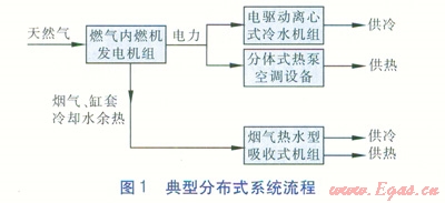 對于典型分布式系統(tǒng)(系統(tǒng)流程見圖1),燃氣內(nèi)燃機發(fā)電機組將天然氣燃燒產(chǎn)生的35%熱能轉(zhuǎn)化為電能,40%的熱能(以煙氣余熱、缸套冷卻水余熱體現(xiàn))利用煙氣熱水型溴化鋰吸收式冷熱水機組(以下簡稱煙氣熱水型吸收式機組)進行供冷、供熱,剩余25%熱能隨煙氣排空。當(dāng)煙氣熱水型吸收式機組無法滿足冷熱負荷時,采用電驅(qū)動離心式水冷機組供冷,分體式熱泵空調(diào)設(shè)備供暖。設(shè)定電能全部用于電驅(qū)動空調(diào)設(shè)備制冷及制熱,離心式冷水機組的制冷系數(shù)取4.5,分體式熱泵空調(diào)的制熱系數(shù)取3.5,則可分別獲得158%的冷能及123%的熱能。設(shè)定煙氣熱水型吸收式機組的制冷系數(shù)為1.3、制熱系數(shù)為0.95,利用40%的天然氣燃燒熱能,可獲得52%的冷能及38%的熱能。