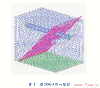 斷層是土體之發(fā)生相對位移的破裂面,斷盤指斷層兩側(cè)的巖土,位于斷層之上的稱為上盤,斷層之下的稱為下盤。將斷層運動考慮為其中一盤相對靜止,另一盤相對該盤運動,將約束加在相對不動的一盤上。設定上盤為運動盤,下盤為相對靜止盤。重力荷載直接加到整個模型上,方向垂直向下;位移荷載加到上盤,方向沿斷層傾角斜向下;地震力集中作用到上盤。模型網(wǎng)格劃分結(jié)果見圖1,管道選用8節(jié)點網(wǎng)格,土體選用4節(jié)點網(wǎng)格。