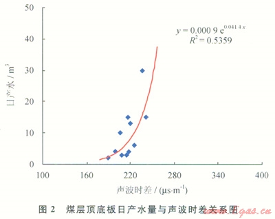 基于上述研究可知,煤層頂?shù)装宓某鏊耘c聲波時差、砂巖厚度、孔隙度及砂巖距煤層距離具有良好的相關(guān)性。由于聲波時差地反映砂巖的孔隙度較好,故在分析評價時只用孔隙度。于是,構(gòu)建與煤層厚度、孔隙度及砂巖距煤層距離3個參數(shù)相關(guān)的煤層頂?shù)装瀹a(chǎn)水量綜合評價參數(shù)(W)。求取W的公式為: