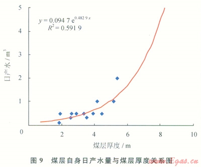 煤層直接頂?shù)装鍨樯皫r時,物性較好,且砂巖厚度越大,則頂?shù)装迳皫r的含水性越強(qiáng),煤層壓裂后頂?shù)装迳皫r的地層水易于產(chǎn)出,排采出水量亦較大。如果砂巖為老頂?shù)?,但直接頂?shù)装宓哪鄮r較薄,壓裂時容易壓穿直接頂?shù)装宓哪鄮r,致使壓裂縫溝通了老頂?shù)椎纳皫r而增大出水量,且隨著砂巖距煤層越近,越易于壓穿直接頂而溝通砂巖含水層,為此,頂?shù)装迳皫r的厚度、孔隙度及距煤層的距離與煤層排采出水量有較大的關(guān)系。