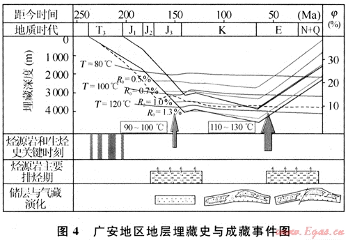 根據(jù)川中廣安地區(qū)包裹體均一溫度分析,須四段氣藏包裹體的均一溫度主要分為90~100℃與110~130℃2個帶,且高溫帶數(shù)量占明顯優(yōu)勢,進(jìn)一步分析得知,高溫包裹體冰點(diǎn)溫度很低,反映含鹽度較高,主要賦存于石英微裂隙中,認(rèn)為其是在晚期的構(gòu)造抬升階段形成的,從而證實(shí)了構(gòu)造抬升對油氣大面積成藏的重要建設(shè)性作用(圖4)。