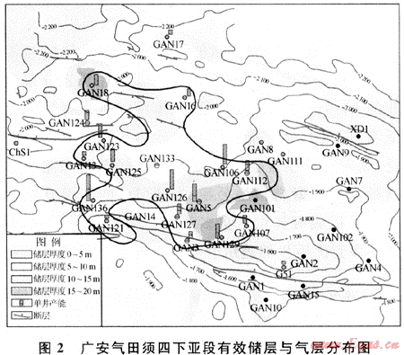 但是,構(gòu)造高部位與有效儲層的配合,可以提高單井產(chǎn)能,如須六段氣藏的廣安2井;另外,須六段氣藏的氣水關(guān)系較明確,氣水分異較好,與構(gòu)造起伏的貢獻(xiàn)是分不開的。而須四段的氣層分布沒有與構(gòu)造起伏很好地配合,導(dǎo)致其氣水關(guān)系復(fù)雜,產(chǎn)能分布規(guī)律性不如須六段明顯。因此,廣安氣藏是構(gòu)造~巖性和巖性氣藏,構(gòu)造起伏有利于氣水分異和產(chǎn)能的提高。