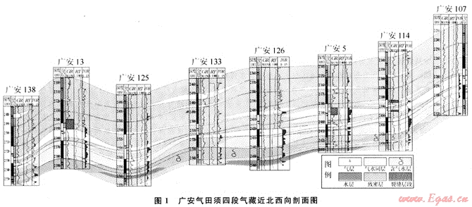 廣安氣田含氣層系主要為須四段和須六段,其疊加起來的探明儲量超過了1300×108m3,含氣回積達(dá)到了800km2,但由于儲層低孔低滲,成巖作用強(qiáng)烈,導(dǎo)致儲層和致密砂巖間互分布[6~7]。致密砂巖的排替壓力高,成為氣藏內(nèi)部的分割層,從而將須四段和須六段氣藏在縱向和橫向上分割成數(shù)個小氣藏,它們相互獨(dú)立,具有不同的氣水和溫壓系統(tǒng),是川中地區(qū)大面積成藏的典型代表。