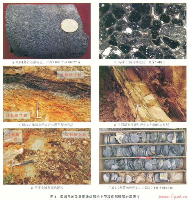 該期抬升運動發(fā)生于燈影組下亞段沉積后,上揚子地臺發(fā)生整體強烈抬升,具有兩個方面的響應(yīng)特征:①抬升運動使燈影組下亞段微生物白云巖露出水面遭受大氣淡水溶蝕而發(fā)育溶蝕孔洞、滲流豆、鈣結(jié)殼、古風(fēng)化殘積礫屑云巖、巖溶角礫巖等。滲流豆石層的頂面是一個比較截然的界面,或者說是一個暴露面或間斷面,滲流豆的出現(xiàn)反映其形成時處于陸上暴露的環(huán)境[18]。高科l井在井深5409~5410m發(fā)育明顯的滲流豆(圖1-a、1-b)。②燈影組下亞段抬升風(fēng)化剝蝕后,地殼發(fā)生強烈伸展作用[19],上揚子地臺重新開始接受海侵沉積,沉積物主要為藍灰色泥巖、黑色頁巖、紫紅色泥巖、砂巖、泥質(zhì)云巖與硅質(zhì)巖,厚數(shù)十厘米至數(shù)十米不等。該“碎屑巖層”與燈影組下亞段呈平行不整合接觸,接觸面凹凸不平(圖1-c、l-f)。