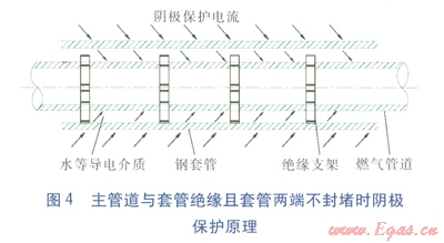 ③不可避免加設(shè)套管時(shí),套管兩端可不必密封防水材料,只要在主管道與套管之間充填柔軟材料防止沙石進(jìn)入對(duì)防腐層起破壞作用即可。因?yàn)楫?dāng)套管內(nèi)有水或泥土存在時(shí),能起到導(dǎo)電介質(zhì)的作用,陰極保護(hù)電流通過(guò)介質(zhì)形成回路,不會(huì)被屏蔽。套管可視為土壤介質(zhì)的一部分,陰極保護(hù)電流從套管外壁流入,從套管內(nèi)壁流出,再?gòu)闹鞴艿劳獠苛魅耄鞴艿缹⑹艿胶芎玫年帢O保護(hù)[2]。如果套管與主管道間有特定性能的電解質(zhì)物質(zhì),導(dǎo)電性能會(huì)更好,主管道陰極保護(hù)的效果會(huì)更好,其原理見(jiàn)圖4。