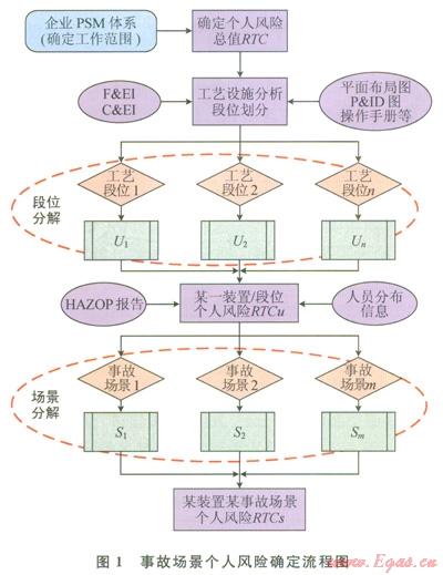 在獲得各工藝段位的個人風(fēng)險準則RTCU之后,進入圖1所示的第2階段的場景分解:根據(jù)HAZOP報告(或其他的工藝災(zāi)害分析PHA結(jié)果),以及設(shè)施的人員分布信息,由下式計算各事故單元的個人風(fēng)險準則RTCS。即