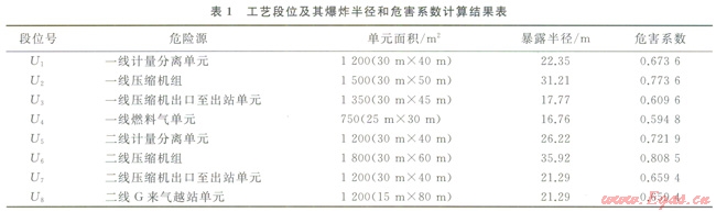 工藝段位(Section)的劃分,除了可以根據(jù)圖2中的各關(guān)斷位置之外,還可以根據(jù)工藝單元或者參考HAZOP報告的節(jié)點來劃分。本例的主要危害后果是天然氣泄漏之后的潛在火災(zāi)爆炸,因此根據(jù)道化F&E指數(shù)計算流程分別對各工藝段位進行計算,結(jié)果如表1所示。