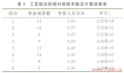 得到各工藝段位的風(fēng)險準則額度后,按照圖1所示的第二階段計算流程,就可以得到某一工藝段位的各事故場景RTCS。為此需要統(tǒng)計該站場內(nèi)的人員分布情況,具體包括站長、自控工程師、設(shè)備工程師、通訊工程師、電氣工程師、運行人員、保管和門衛(wèi)等8類人員。這里各類人員都是當(dāng)作假想人員來加權(quán)考慮的,以避免某一類別的人員數(shù)增加而導(dǎo)致風(fēng)險評估中的Salami切片現(xiàn)象[3]。可信的事故場景數(shù)根據(jù)該站場的HAZOP分析報告確定,此外本例中為簡化起見,令參數(shù)UFU=1。根據(jù)式(4)和式(5)計算得到最終所需要的事故場景定量風(fēng)險容許準則值RTCU,如表3所示。