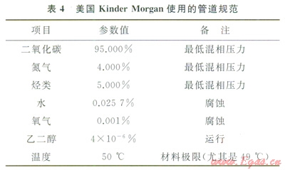日前運(yùn)行的管道中所輸送的CO2混合物及對(duì)純度和含水量的規(guī)定等都不盡相同。國(guó)際上對(duì)于管道系統(tǒng)輸送CO2混合氣體的組成要求沒(méi)有統(tǒng)一的標(biāo)準(zhǔn)。混合氣體的組成要求很大程度上取決于設(shè)計(jì)階段進(jìn)行的評(píng)估,包括流動(dòng)安全、管道完整性、安全性及終端用戶(hù)對(duì)CO2純度的需求。美國(guó)Kinder Morgan使用的管道規(guī)范見(jiàn)表4[12]。