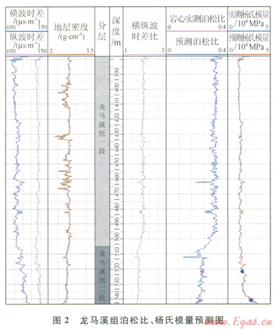 整體龍馬溪組楊氏模量介于l×104~3.5×104MPa,平均為2.3×104MPa;泊松比介于0.1~0.37,平均為0.24。通過圖3可以看出,龍馬溪組一段楊氏模量平均值為1.4×104MPa,泊松比平均值為0.3;龍馬溪組二段楊氏模量平均值為l.8×104MPa,泊松比平均值為0.23。龍馬溪組二段較龍馬溪組一段具有低泊松比,高楊氏模量,說明其脆性優(yōu)于一段。圖4為橫縱波時(shí)差比和泊松比的交會(huì)圖,可以看出龍馬溪組二段的橫縱波時(shí)差比明顯低于一段,說明低橫縱波時(shí)差比參數(shù)用于表征頁巖的脆性程度是有效的。