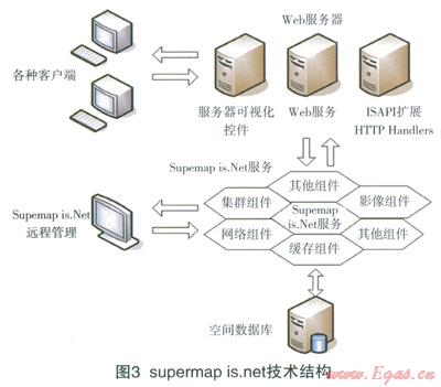 G1S的數(shù)據(jù)庫是以圖形為基礎,根據(jù)不同的要求有不同的數(shù)據(jù)結構[10]。本文采用supermap組建來實現(xiàn)燃氣管道風險水平的可視化。supermap是一個標準的控件GIS產品,可以在多種語言上使用。Supermap中deskpro是一套運行在桌面端的專業(yè)GIS軟件,提供了地圖編輯、屬性數(shù)據(jù)管理、分析與決策輔助事務處理、地圖輸出、報表打印、三維建模等方面的功能。supermap is.net是新一代網絡地理信息系統(tǒng)開發(fā)平臺,supemlap is.net由客戶端用戶界面表現(xiàn)組件、web服務器擴展、GIS服務器、數(shù)據(jù)服務器以及遠程管理器等多個組件組成,如圖3所示[11-13]。
