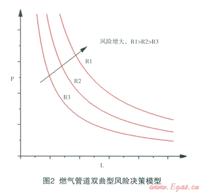 由風險計算公式R=pxl可知燃氣管道事故發(fā)生的概率和可能造成的經濟損失呈倒冪數(shù)關系,因此回歸方程即為R=pxl。用回歸分析法進行相關分析,然后計算預測誤差,最后確定燃氣管道的風險值,即可得到該城市的風險曲線,每段燃氣管道的風險值與此比較,判斷其風險可接受性,即可建立雙曲型風險決策模型如下圖2所示,其中P表示燃氣管道事故發(fā)生的概率,L表示燃氣管道事故發(fā)生造成的損失。
