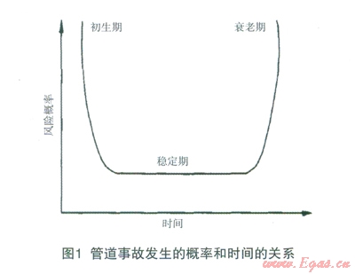 按照W.KentMuhlbauer的分類方法,造成管道失效和事故的原因共4大類:①第三方破壞。第三方破壞原因是指燃氣管道因最小埋深、地面上的活動狀況(水平)、當?shù)鼐用竦乃刭|(公眾教育)、管道地上設備安全、線路狀況、巡線頻率等因素,這些因素以外力擠壓或人為破壞的形式使燃氣管道受到損壞。②管道腐蝕。腐蝕是導致燃氣管道(主要是鋼管)穿孔、破裂的重要破壞因素。對于埋地管道而言,腐蝕來自兩個方面:內腐蝕和外腐蝕。③人工誤操作。人工誤操作包括設計誤操作、施工誤操作、技術誤操作、管理與監(jiān)督誤操作、運行維護與檢測誤操作等,這些誤操作會導致燃氣管網運行的安全性降低,風險增加。④管網設計。設計需考慮的因素有管道最大承受壓力、管內水擊因素、設計厚度和選材選型、士層移動、線路選擇、施工方案等,考慮不周會導致燃氣事故的發(fā)生。在實際風險管理中,用普通的概率計算方法計算其風險概率相當困難,有些還不可能實現(xiàn)。因此,采用美國核管理委員會(NUREG)推薦的方法,通過計算失效速率得出風險概率。由分析統(tǒng)計的相關資料可知,管道發(fā)生事故的風險概率一般符合U型曲線(見圖l),即初期處于磨合階段,管道工作并不穩(wěn)定,后期接近設計壽命,事故發(fā)生也較頻繁。若只考慮中間的穩(wěn)定期,則其風險速率v可視為常數(shù)。