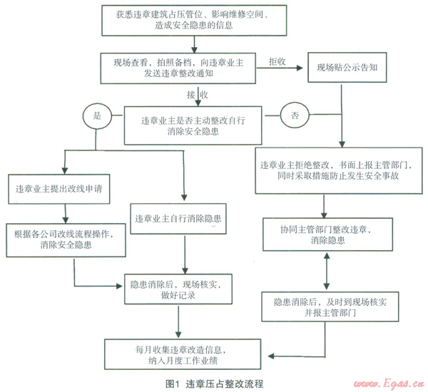 地上建筑物或構(gòu)筑物直接壓占到燃氣管線上方一般稱為違章壓占,它不僅危害燃氣管網(wǎng)的安全,而且阻礙了管網(wǎng)巡查和搶修工作,但是由于各家燃氣公司沒有執(zhí)法權(quán),違章的整改大部分要依賴于政府。因此違章占壓的整改工作一方面是各家燃氣公司的工作重點,另一方面,又必須借助外力才能進行。