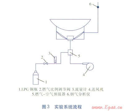 新型炒菜灶與傳統(tǒng)炒菜灶的實驗系統(tǒng)基本一致。實驗裝置包括LPG鋼瓶、煙氣分析儀、燃氣比例調節(jié)閥、流量計、電子溫度計等。煙氣分析儀用于測量煙氣中CO體積分數(shù),燃氣比例調節(jié)閥用于調節(jié)控制LPG的流量,流量計用于計量LPG累計流量。實驗系統(tǒng)流程見圖3。