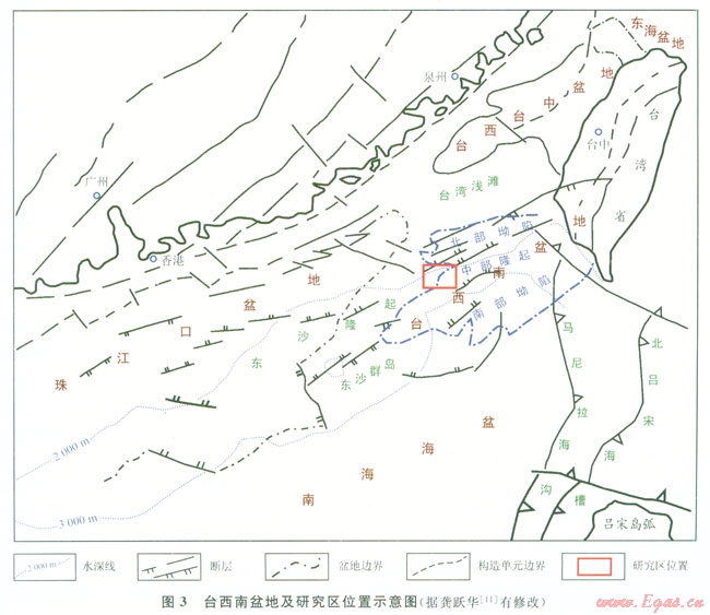 研究區(qū)位于臺(tái)西南盆地的中部隆起區(qū)附近[11](圖3),西鄰臺(tái)灣峽谷(即福爾摩沙峽谷),東接澎湖峽谷,所處海域海底地形地貌復(fù)雜(圖2),發(fā)育海槽、海谷、海山、陡崖、斜坡、沖刷溝、海丘等。如臺(tái)灣峽谷,深切南海北部斜坡,全長(zhǎng)約110km[5],可作為大量沉積物的運(yùn)輸通道。