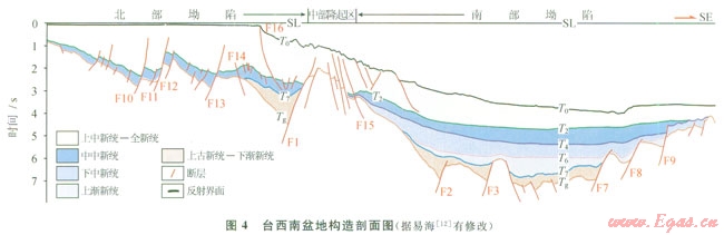 臺(tái)西南盆地的中部隆起緊鄰盆地的南、北坳陷”(圖4)。新生代以來(lái)自下而上發(fā)育古近系(古新統(tǒng)、始新統(tǒng)、漸新統(tǒng))、新近系(中新統(tǒng)、上新統(tǒng))和第四系。盆地?fù)碛兄猩?、古新統(tǒng)始新統(tǒng)、上新統(tǒng)—中中新統(tǒng)、上中新統(tǒng)更新統(tǒng)共4套氣源巖,有機(jī)質(zhì)成熟度高,多為腐殖型干酪根,氣源條件較好[11]。研究區(qū)水合物藏主要發(fā)育于上中新統(tǒng)一第四系全新統(tǒng)。