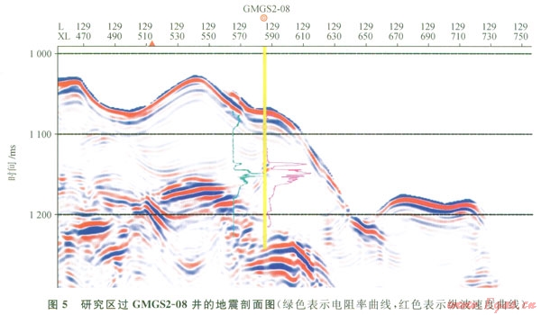 通過(guò)合成記錄,可以將GMGS2-08井的測(cè)井曲線疊加到地震剖面上(圖5)。從圖5中的聲波測(cè)井曲線可以看出,BSR是一個(gè)明顯的速度分界面,附近地層存在著明顯的速度倒轉(zhuǎn)現(xiàn)象(圖5),即BSR之上為速度相對(duì)較高的含水合物層,之下則為聚集的低速游離氣層,這與正常沉積地層自淺至深速度逐漸增大剛好相反[20]。BSR這一速度特征與含天然氣水合物的“游離氣體帶”模型非常吻合[13],而BSR的橫向變化則可能指示天然氣水合物呈層狀分布,以厚層塊狀的形式分布于水合物穩(wěn)定帶內(nèi)的高速層中。