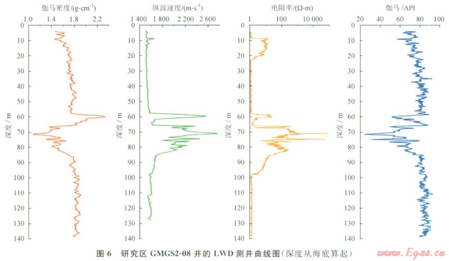 6)GMGS2-04井。水深913m,137~143mbsf層段測(cè)井資料顯示電阻率為4W·m,推測(cè)可能為分散狀水合物。