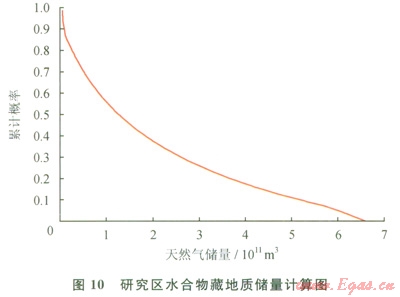 利用自主研發(fā)的計(jì)算軟件[23-24](圖10),在50%概率條件下,初步估算研究區(qū)水合物地質(zhì)儲(chǔ)量約為1250×108m3天然氣,其規(guī)模相當(dāng)于一個(gè)特大型常規(guī)天然氣田。