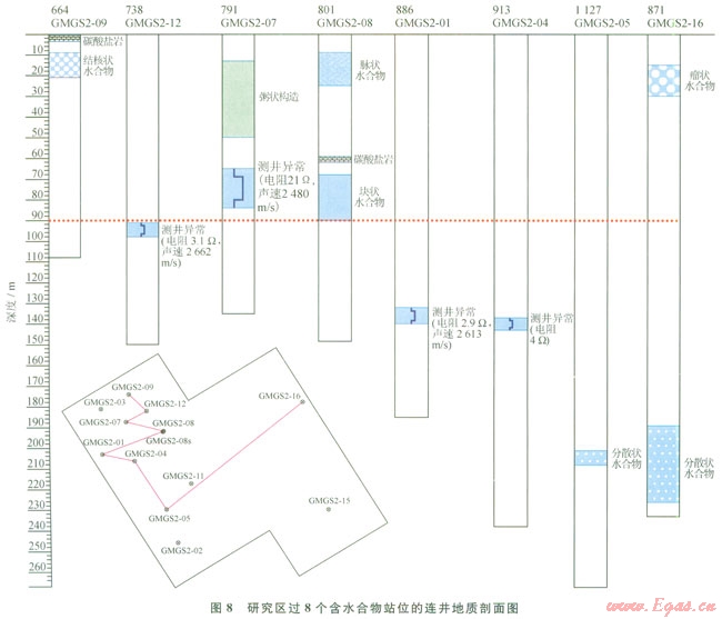 8)GMGS2-01井。水深886m,132~140mbsf層段測(cè)井資料顯示電阻率為2.9W·m,聲速為2613m/s,綜合推測(cè)可能為分散狀水合物。
