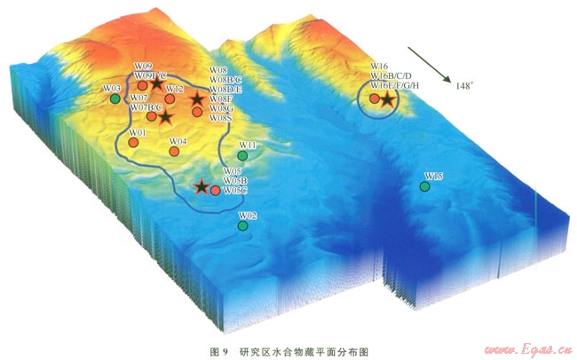 根據(jù)鉆測(cè)井資料解釋和取心結(jié)果,圈定出水合物藏的分布范圍(圖9),面積約55km2。以臺(tái)灣峽谷的一個(gè)分支為界,將研究區(qū)的水合物分為東、西2個(gè)成藏區(qū),西成藏區(qū)由7口井(GMGS2-08、GMGS2-09、GMGS2-07、GMGS2-05、GMGS2-04、GMGS2-01,GMGS2-12)控制,水深介于664~1127m,各井發(fā)育水合物的層數(shù)不均,除GMGS2-08井發(fā)育深、淺兩個(gè)水合物層形成復(fù)式水合物藏以外,其他大多數(shù)站位僅發(fā)育單個(gè)水合物層,依此圈定的西成藏區(qū)面積相對(duì)較大,成藏區(qū)平面整體呈北西南東向,與上述分支海槽走向近似一致;東成藏區(qū)僅由Wl6站位單井控制,面積目前尚難以準(zhǔn)確劃定。