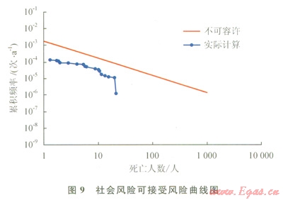 歐美等一些國家和石油天然氣企業(yè)已經(jīng)建立有自己的風(fēng)險(xiǎn)可接受標(biāo)準(zhǔn)。我國于2011年國家安全生產(chǎn)監(jiān)督管理總局頒布了《危險(xiǎn)化學(xué)品重大危險(xiǎn)源監(jiān)督管理暫行規(guī)定》,制定了危險(xiǎn)化學(xué)品重大危險(xiǎn)源的風(fēng)險(xiǎn)可接受標(biāo)準(zhǔn),除此以外沒有一個(gè)統(tǒng)一的或行業(yè)的風(fēng)險(xiǎn)可接受標(biāo)準(zhǔn)。因此,筆者所在公司自2009年就開展了高含硫氣田開發(fā)風(fēng)險(xiǎn)可接受標(biāo)準(zhǔn)的研究,并提出了公眾個(gè)人風(fēng)險(xiǎn)標(biāo)準(zhǔn)(0.8×10-4),員工個(gè)人風(fēng)險(xiǎn)(1.5×10-3)和社會(huì)風(fēng)險(xiǎn)[1.4×10-3(N=1),斜率取-1]基準(zhǔn)值以供參考。