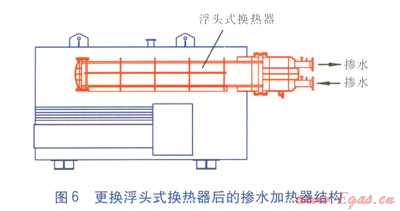 將原加熱盤管拆除(見圖4),更換成浮頭式換熱器(見圖5)。改造完畢后,按要求試壓。1臺(tái)摻水加熱爐安裝1臺(tái)浮頭式換熱器,另制造1臺(tái)浮頭式換熱器作為3臺(tái)摻水加熱爐的備用換熱器。當(dāng)某臺(tái)浮頭式換熱器結(jié)垢嚴(yán)重,需要清垢時(shí),先停爐拆下該浮頭式換熱器,更換上備用換熱器,然后摻水加熱爐繼續(xù)運(yùn)行,從而減輕對正常運(yùn)行的影響。更換浮頭式換熱器后的摻水加熱器結(jié)構(gòu)見圖6。