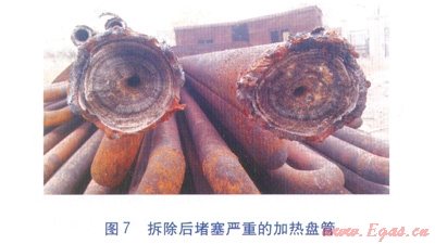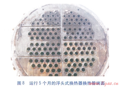 3臺(tái)摻水加熱爐于2012年10月陸續(xù)改造完成,并同期投產(chǎn)運(yùn)行。改造后的3臺(tái)加熱爐運(yùn)行情況基本平穩(wěn),直至2013年3月才陸續(xù)出現(xiàn)換熱效率低的現(xiàn)象。原加熱盤管基本兩個(gè)月就需要酸洗一次,酸液對金屬的腐蝕性強(qiáng),易揮發(fā)產(chǎn)生酸霧污染原油,降低管道及設(shè)備的使用壽命[1]。而且隨著運(yùn)行時(shí)間的延長,酸洗的次數(shù)增加,加熱盤管內(nèi)壁結(jié)垢傾向越來越嚴(yán)重,酸洗也變得無能為力。而改造后的浮頭換熱器能夠通過機(jī)械通洗繼續(xù)使用,清洗周期也比原加熱盤管有所延長。拆除后堵塞嚴(yán)重的加熱盤管見圖7,運(yùn)行5個(gè)月的浮頭式換熱器換熱管端面見圖8。實(shí)踐充分證明,采用浮頭式換熱器替代蛇形加熱盤管,內(nèi)壁涂覆防垢涂層并提高摻水流速,有效地延緩了清洗時(shí)間。浮頭式換熱器可抽出,方便清洗,確保了原油正常生產(chǎn)。
