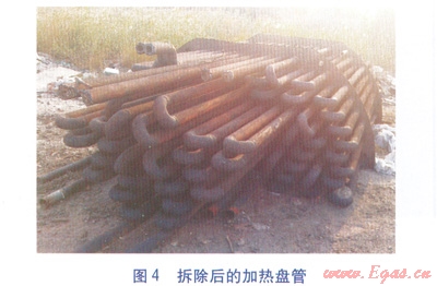污垢樣品的化學(xué)分析結(jié)果表明,污垢主要為含油性碳酸鈣等鹽類污垢,并含有少量泥沙。對摻水進(jìn)行檢測后發(fā)現(xiàn),水中油質(zhì)量濃度達(dá)70~150mg/L,還含有少量的泥沙。當(dāng)含油摻水在加熱盤管內(nèi)溫度不斷升高后,極易在加熱盤管內(nèi)壁形成污垢,造成加熱盤管管壁熱阻加大,介質(zhì)流動(dòng)阻力增大,最終嚴(yán)重堵塞盤管,導(dǎo)致加熱爐無法正常運(yùn)行。采用酸液清洗后,雖然加熱盤管的換熱能力有所提升,但由于加熱盤管內(nèi)摻水實(shí)際流速低(低于0.5m/s),且酸洗造成盤管內(nèi)表面粗糙,易結(jié)垢的因素并未消除,因此很快再次出現(xiàn)換熱效率下降的問題。
