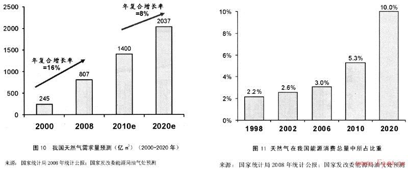 綜上所述,我國天然氣行業(yè)未來幾年仍將保持高速增長。國家發(fā)改委能源局油氣處預(yù)測未來天然氣需求仍將保持快速增長,2010年天然氣需求將達(dá)到1400億m3,2020年將達(dá)到2037億m3,2010年至2020年復(fù)合增長率達(dá)到8%(見圖10)。此外,天然氣在中國能源消費(fèi)總量構(gòu)成中的占比逐年提高,預(yù)計(jì)到2010年將達(dá)到5.3%,到2020年將達(dá)到10%(見圖11)。